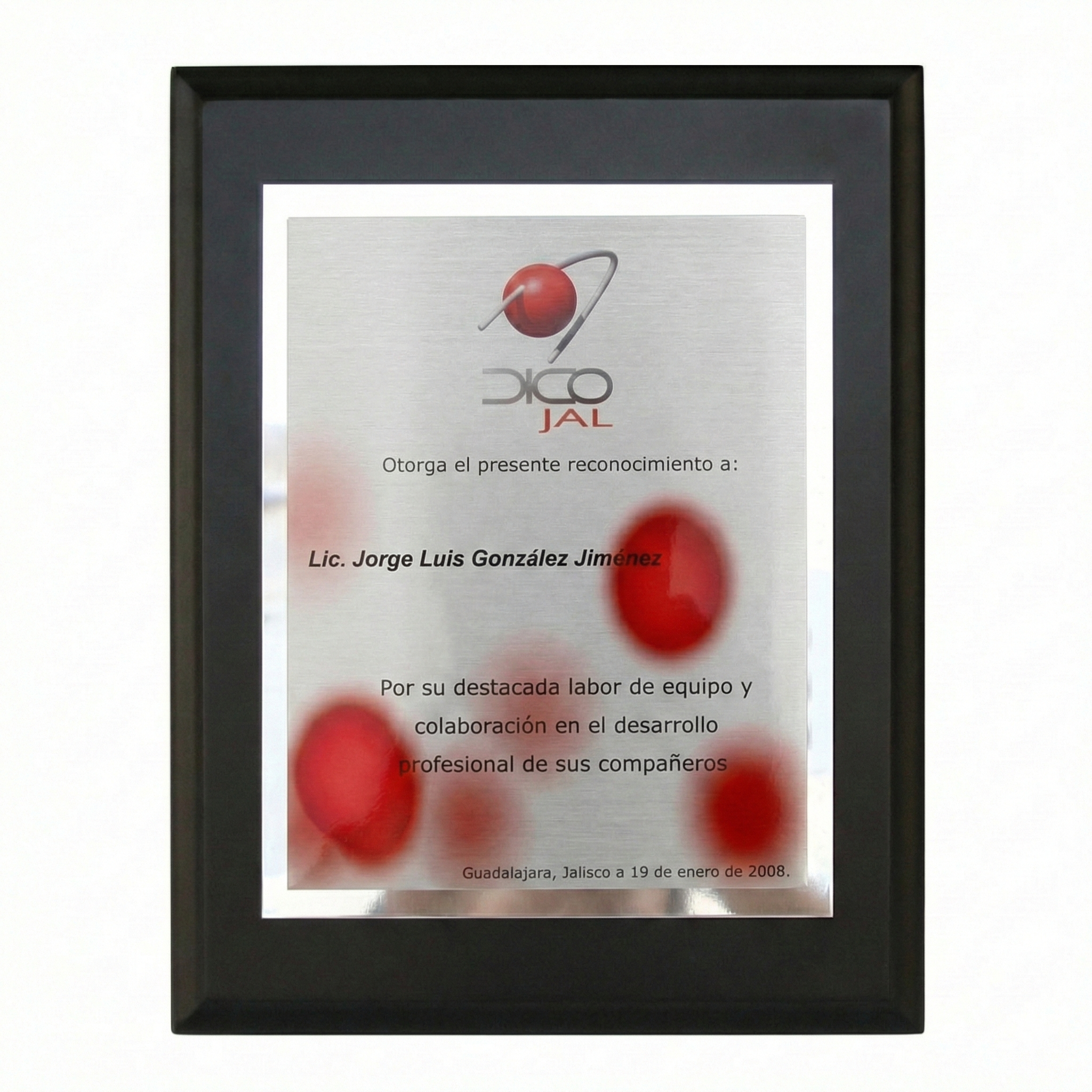 MATERIALES, COLORES Y ACABADOS: Base de MDF negra con acabado mate de 26.5x34 cm. Fondo de aluminio plata brillante de 20x25 cm. Impresión a color en aluminio plata satinado de 17.5x22.5 cm.